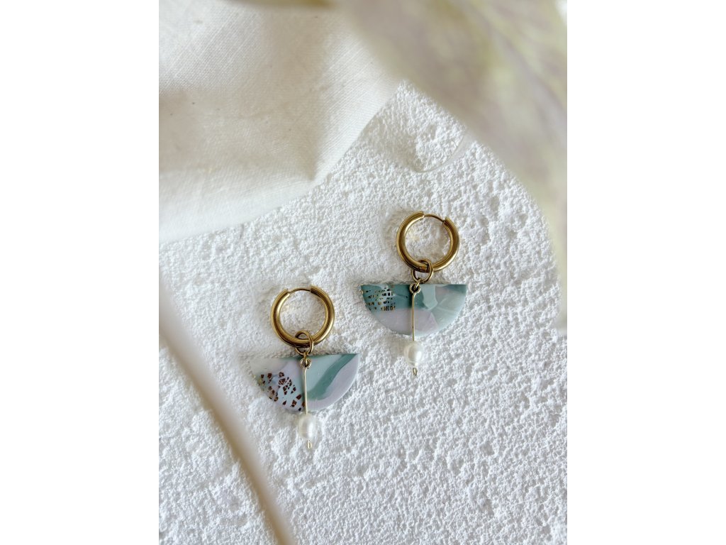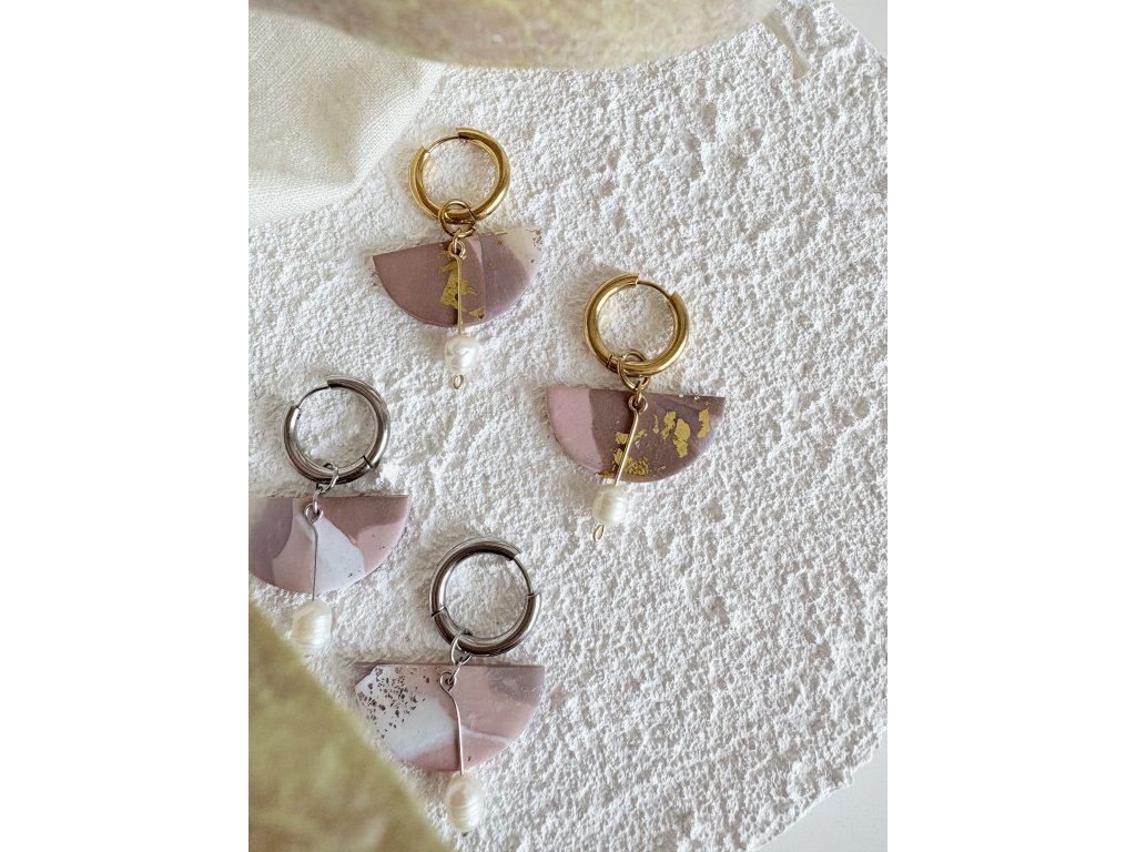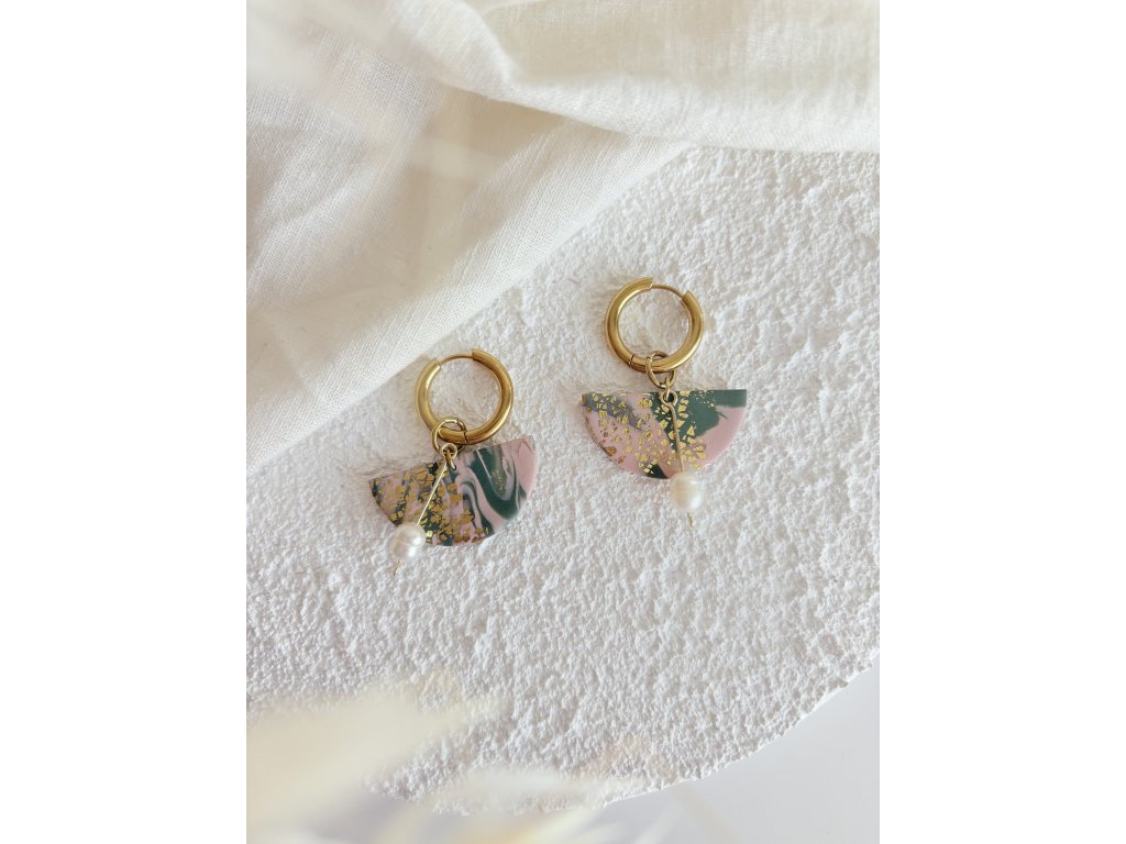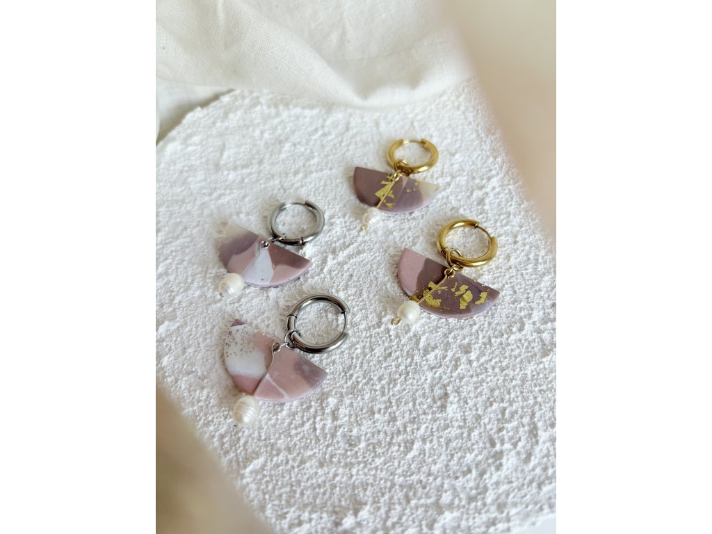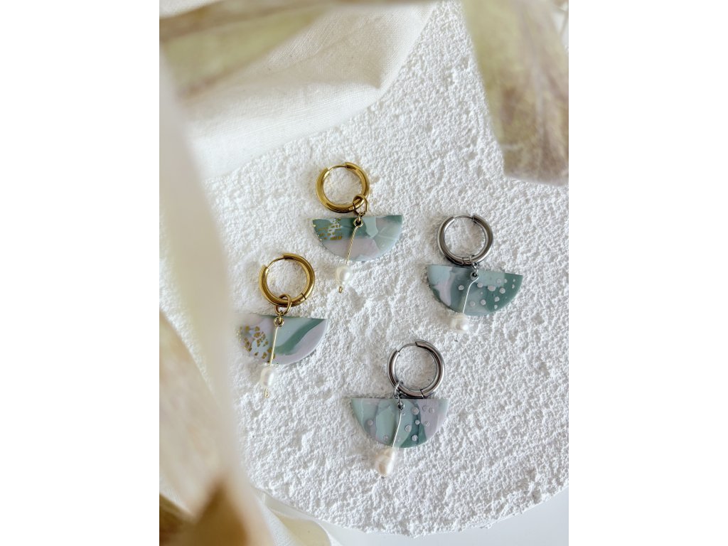 Minimalistické kruhové náušnice s průměrem 16 mm a tloušťkou 3 mm, doplněné ručně tvarovaným přívěskem z polymerové hmoty v jemných tónech. Každý kousek je originál – některé zdobí zlaté lístky, jiné čistá kombinace barev, vždy však doplněné o pravou říční perličku.