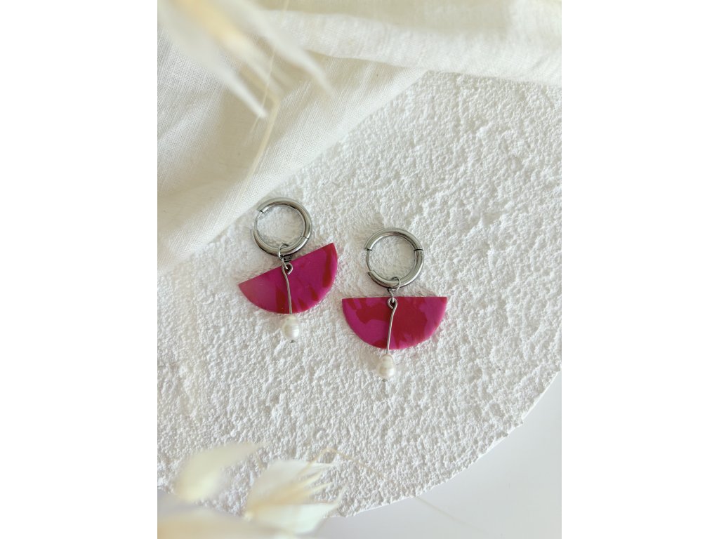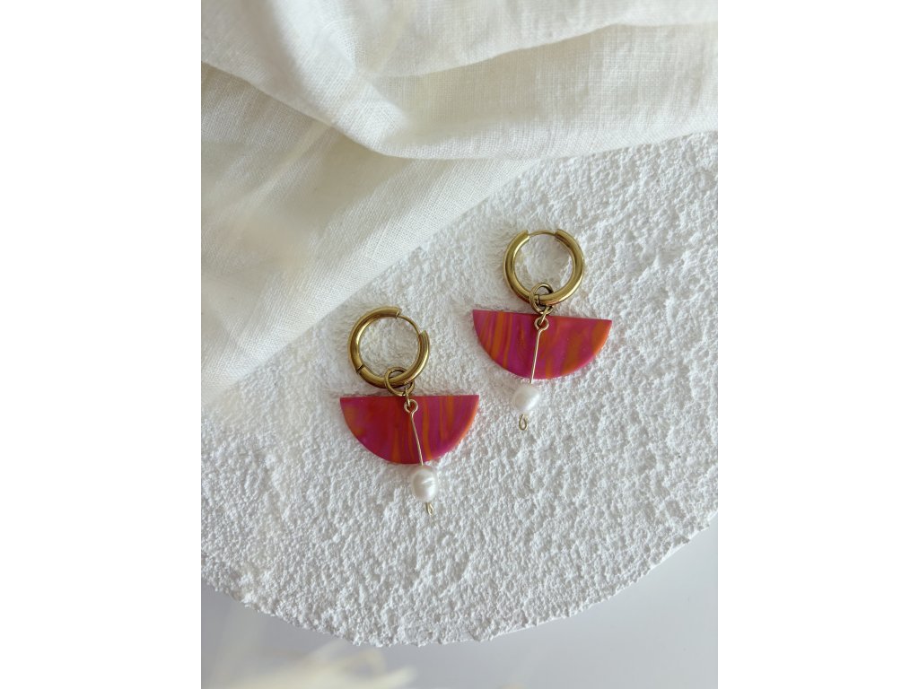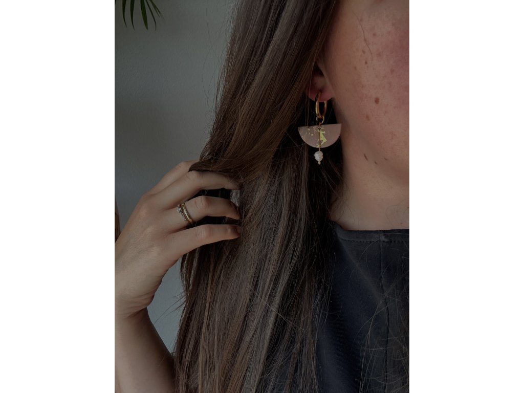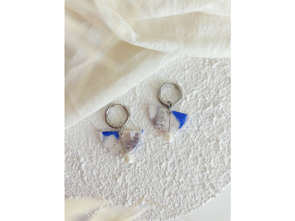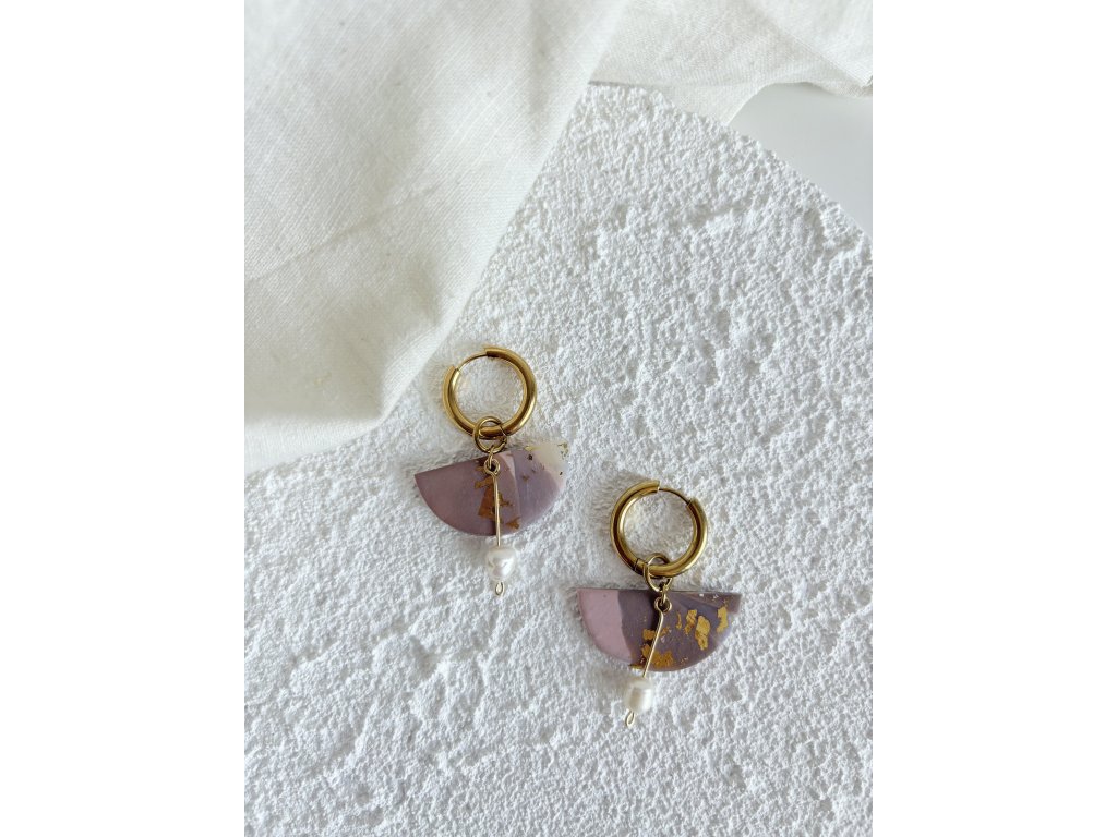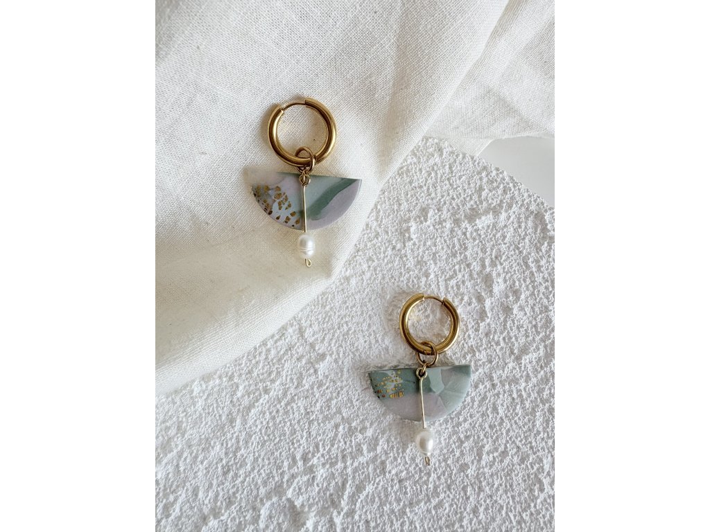 Minimalistické kruhové náušnice s průměrem 16 mm a tloušťkou 3 mm, doplněné ručně tvarovaným přívěskem z polymerové hmoty v jemných tónech. Každý kousek je originál – některé zdobí zlaté lístky, jiné čistá kombinace barev, vždy však doplněné o pravou říční perličku.