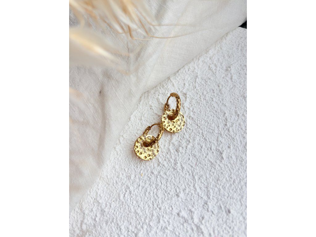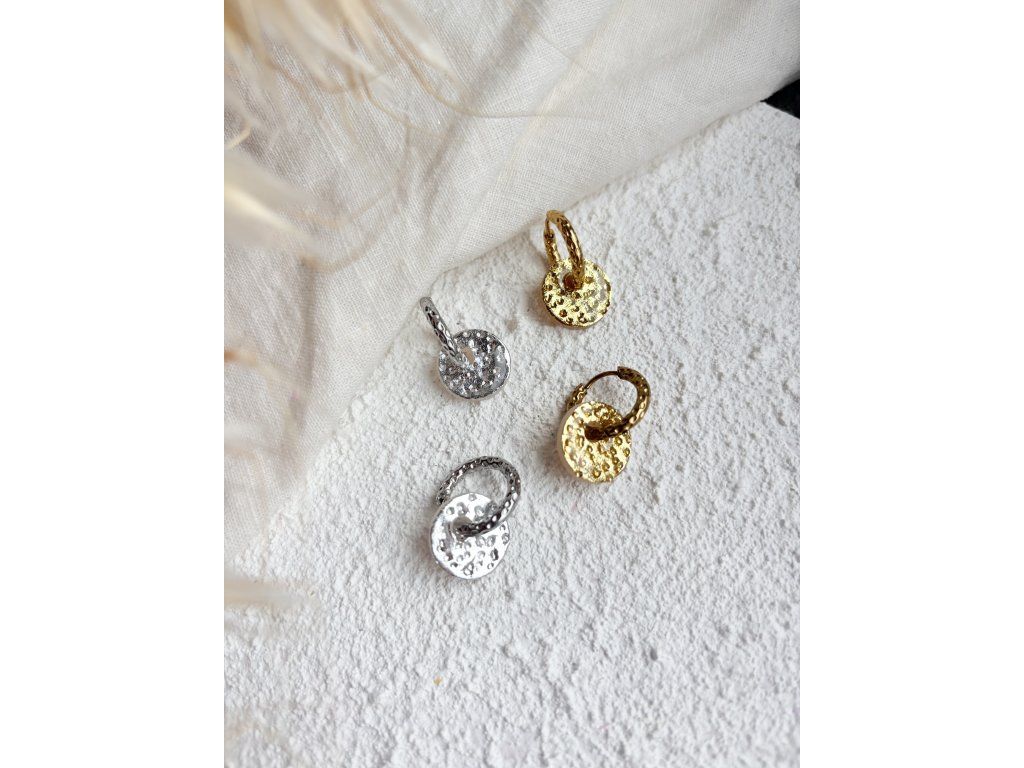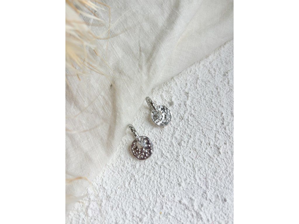 Jemné náušnice s minimalistickým kroužkem a kulatým přívěskem, jehož struktura připomíná ručně tepaný kov. Přestože působí jako kovový šperk, přívěsek je vyrobený z polymeru – díky tomu jsou náušnice velmi lehké a příjemné na celodenní nošení.