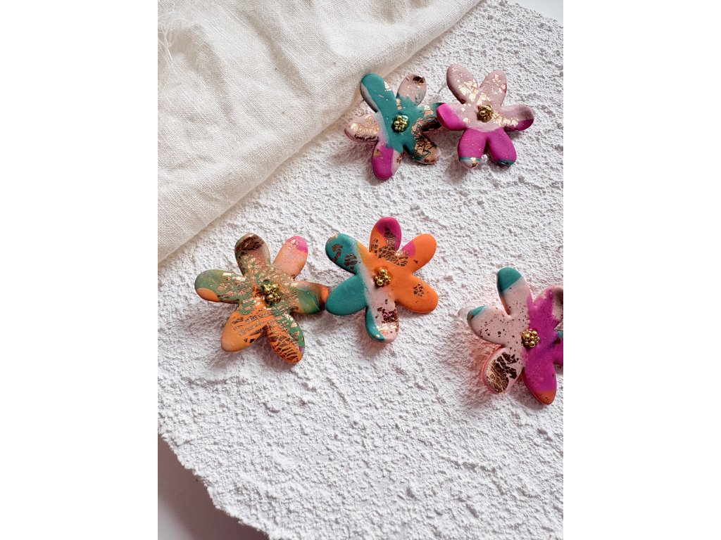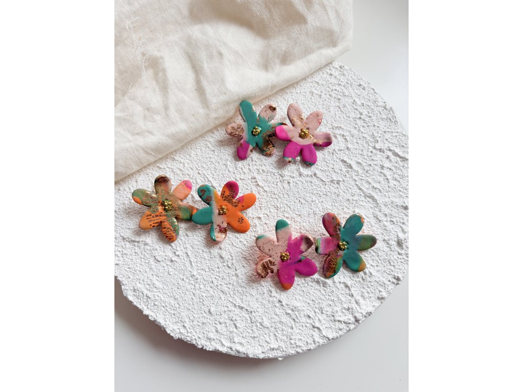 Hravé květy plné barev a energie. Náušnice Bloom vznikly jako oslava radosti, hravosti a originality. Každý květ je ručně tvarovaný a barevně jedinečný, doplněný jemným zlatým detailem ve středu. Nepravidelnosti a barevné přechody jsou záměrné – dělají z každého páru malý originál.