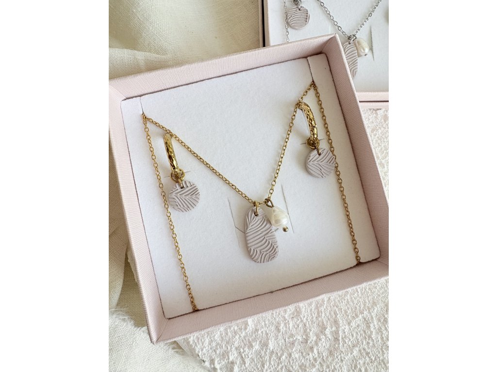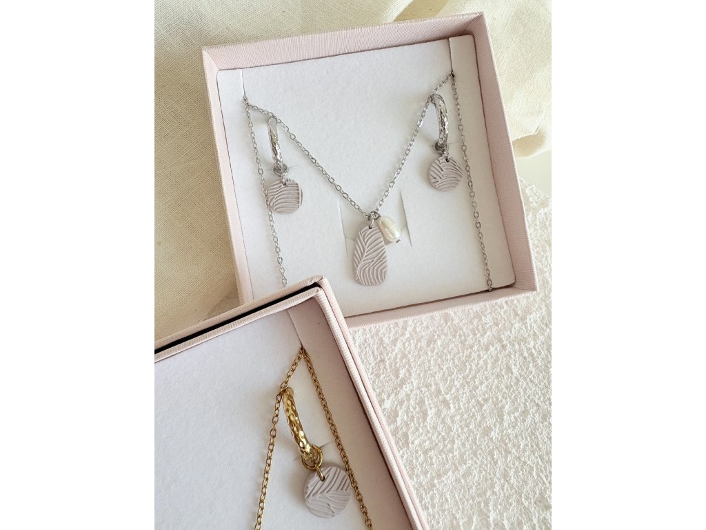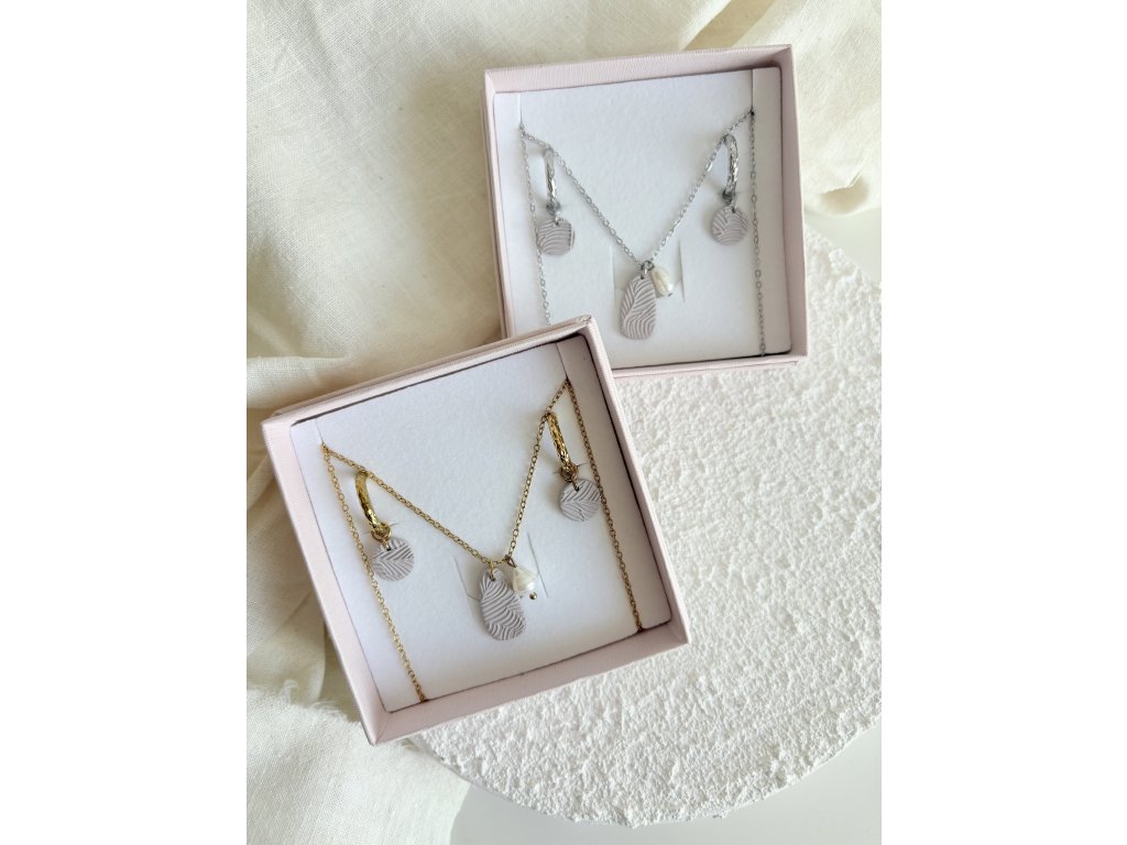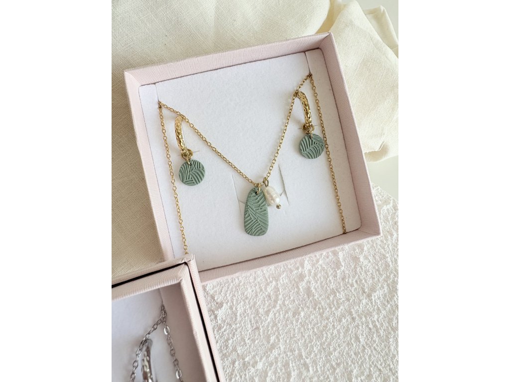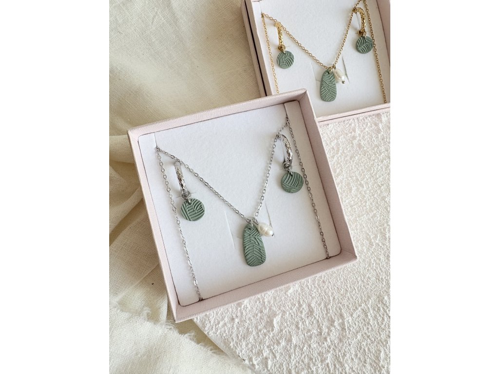Elegantní set náušnic a náhrdelníku, ve kterém se jemná perla potkává s listovým motivem v zeleném a bežovém odstínu. K dispozici ve zlatém i stříbrném provedení – ideální volba pro ženy, které milují přírodní motivy a minimalistický styl. Perfektní jako dárek v krásné dárkové krabičce.