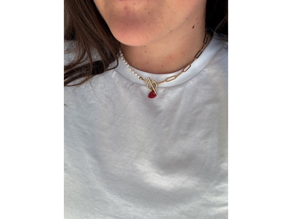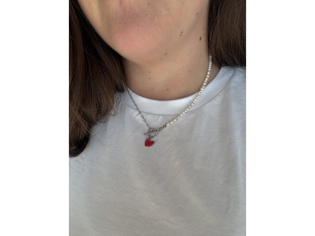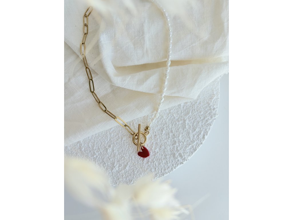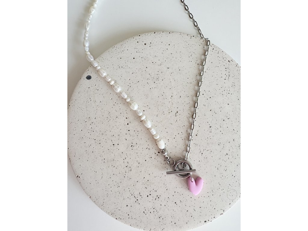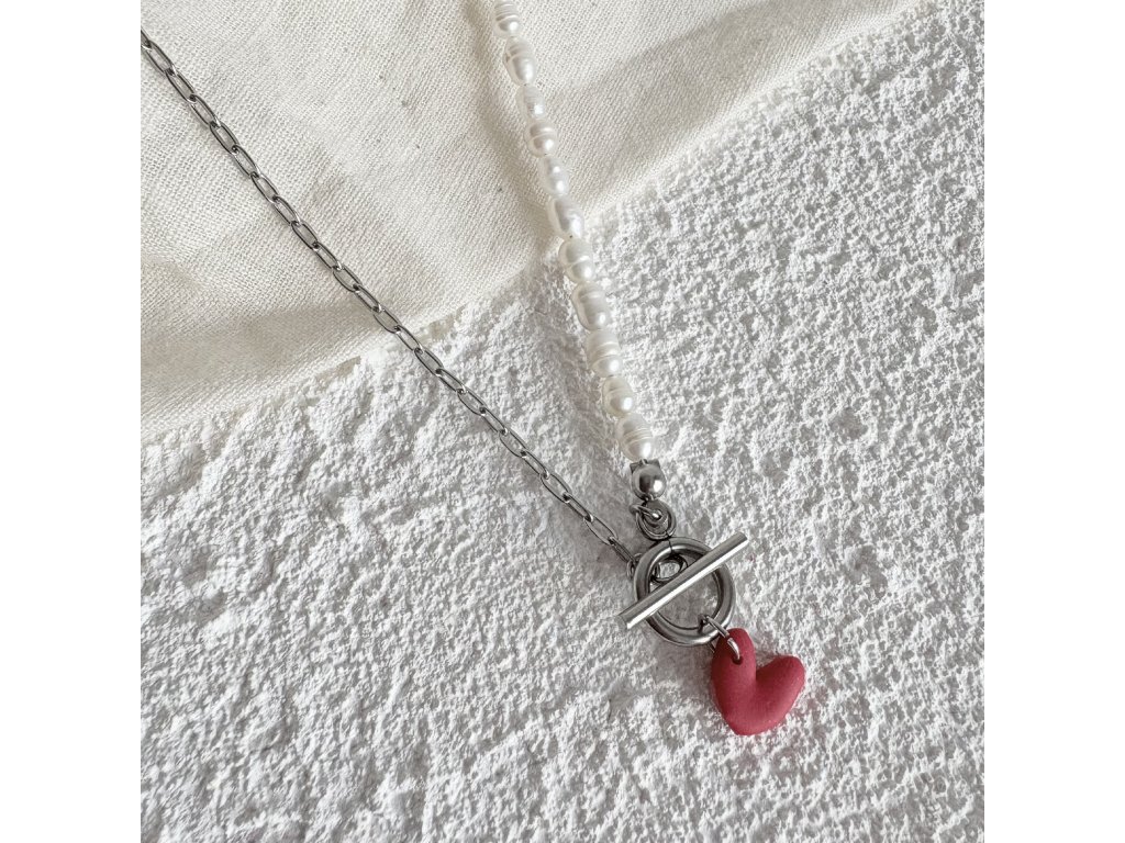 Pravé říční perly, doplněné o srdcový přívěsek z polymeru. Komponenty jsou z chirurgické oceli.