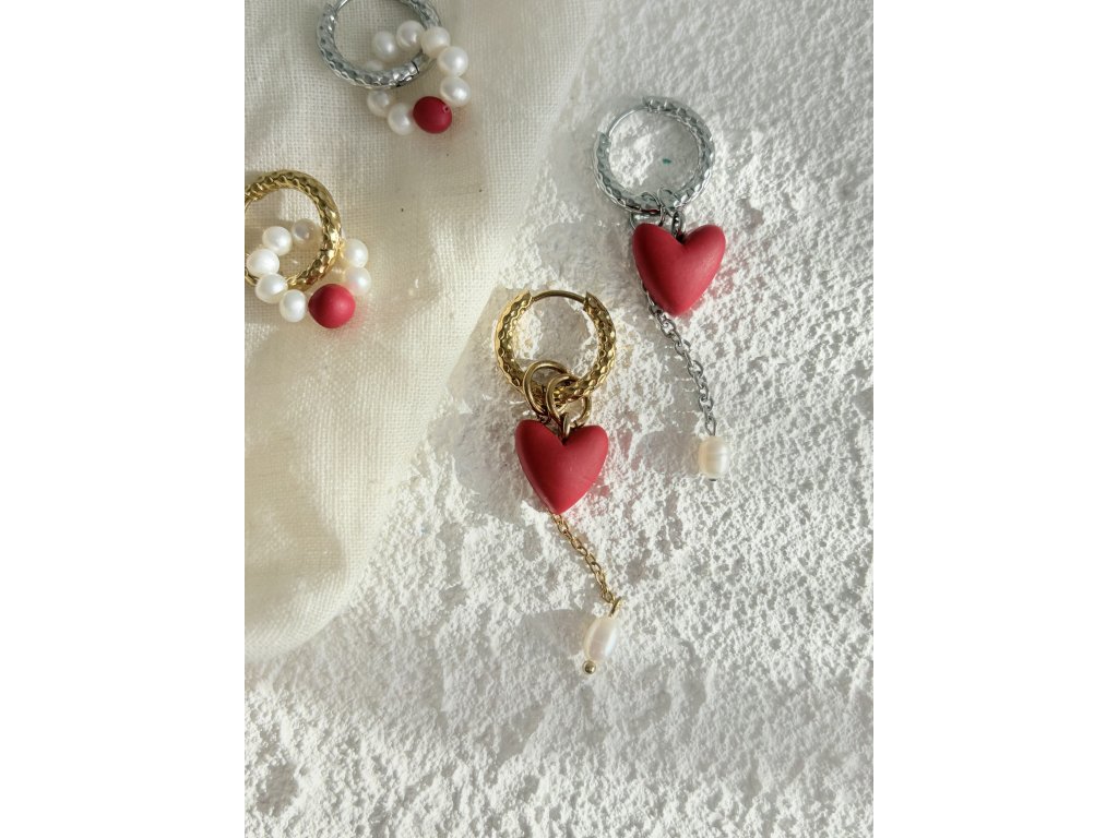 Náušnice, které mají vlastní rytmus. Pulz srdce spojuje kov, perly a ručně tvarované červené srdce do harmonického celku, který bije v tempu dne i emocí.