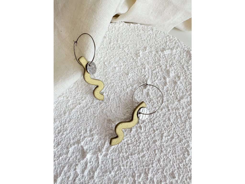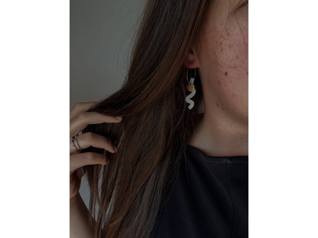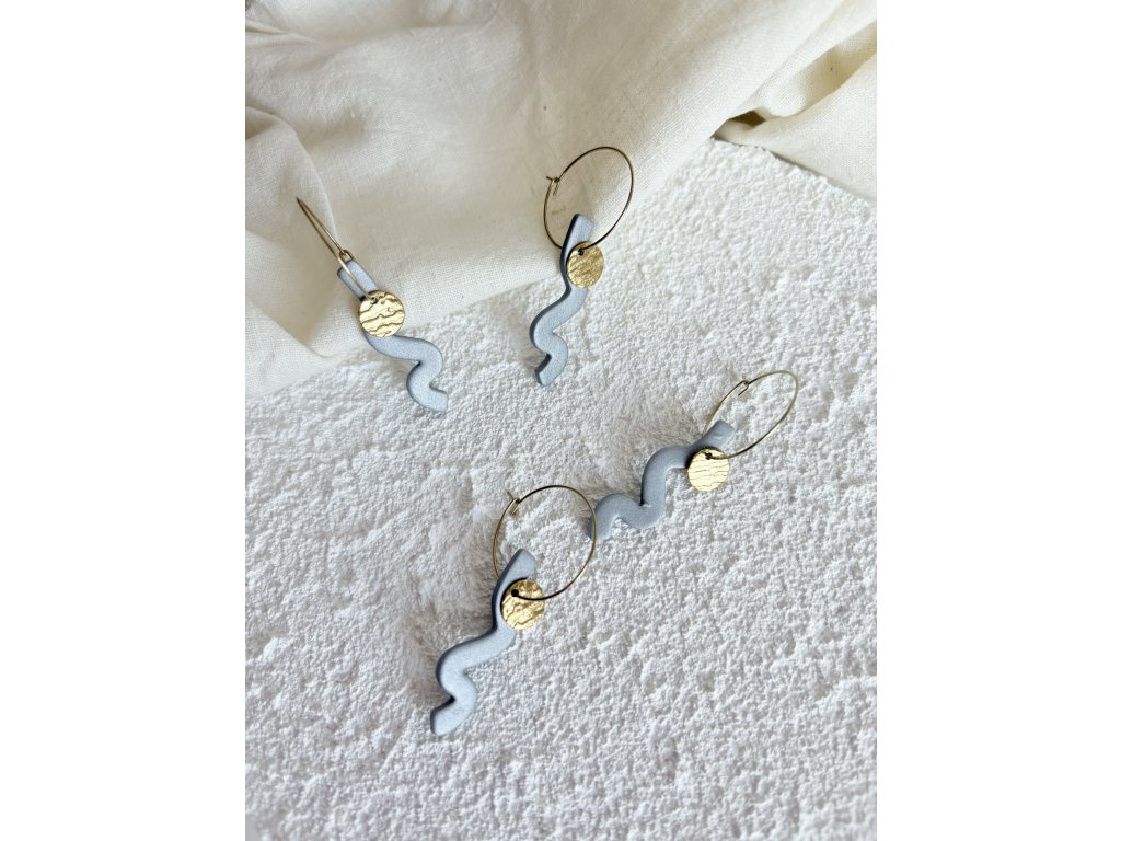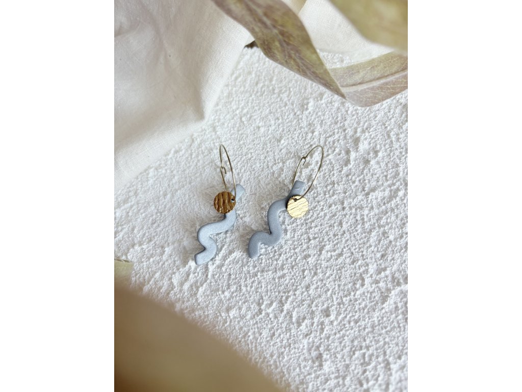 Originální visací náušnice s jemným kroužkem a plastickým přívěskem ve tvaru vlny. Ručně modelovaná polymerová hmota se krásně doplňuje s kovovým detailem.